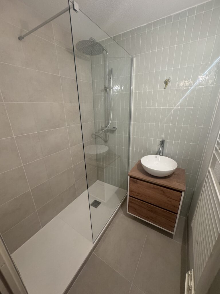 Pour ce projet, SAS Gautier Thibaud a créer une douche à l’italienne élégante, intégrée parfaitement dans un espace réduit, tout en maximisant le confort et l’esthétique. La paroi fixe en verre et le receveur de douche extra-plat apportent une touche de modernité et de légèreté à l’ensemble. Les carreaux muraux, choisis avec soin, créent une ambiance apaisante et harmonieuse, tout en garantissant une parfaite étanchéité.